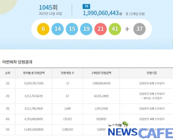 [뉴스카페]10일 추첨한 동행복권 1045회 로또6/45 1등 당첨자는 13명으로 1인당 19억9,006만원씩의 당첨금을 받는다.
