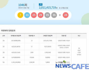 [뉴스카페]17일 추첨한 동행복권 1046회 로또6/45 1등 당첨자는 12명으로 1인당 20억1,141만원씩의 당첨금을 받는다.