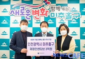 [뉴스카페]인천 미추홀구(구청장 이영훈)는 지난 27일 정부세종청사에서 개최한 ‘새 정부 지방규제혁신 우수기관 인센티브 수여식’에서 우수 지방자치단체에 선정됐으며 그에 따른 재정 인센티브 3억 원을 확보했다.