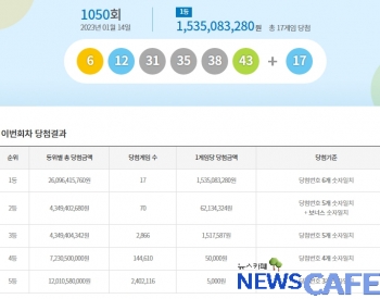 [뉴스카페]14일 추첨한 동행복권 1050회 로또6/45 1등 당첨자는 17명으로 1인당 15억3,508만원씩의 당첨금을 받는다.