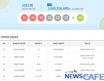[뉴스카페]21일 추첨한 동행복권 1051회 로또6/45 1등 당첨자는 18명으로 1인당 16억6,955만원씩의 당첨금을 받는다.