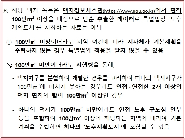 이번에 국토교통부가 발표한 < 노후계획도시 정비 및 지원에 관한 특별법안 > 은 성남 분당 등 1 기 신도시를 포함해 20 년 이상 노후화된 100 만 ㎡ 이상 모든 지역을 대상으로 하고 있다 .