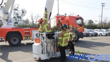 [뉴스카페]인천중부소방서(서장 정기수)는 14일 본서 다목적훈련장에서 고층건물 화재를 대비한 굴절차 활용 화재진압 훈련을 실시했다.