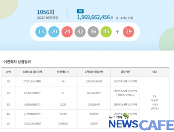 [뉴스카페]25일 추첨한 동행복권 1056회 로또6/45 1등 당첨자는 14명으로 1인당 19억6,966만원씩의 당첨금을 받는다.
