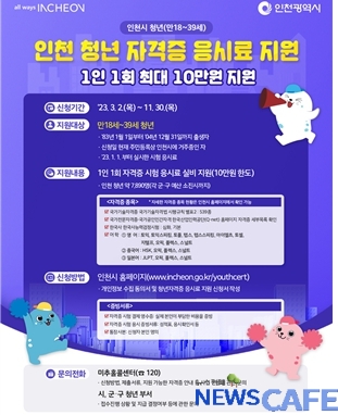 [뉴스카페]인천광역시(시장 유정복)는 취업에 어려움을 겪고 있는 인천 청년을 격려하고, 경제적 부담을 덜어 주기 위해 자격증·어학 등 시험 응시료를 1인당 연 1회, 최대 10만 원까지 지원한다고 밝혔다. 청년들의 요구를 반영한 이 사업은, 17개 전국 시·도 중에서는 최초다.