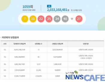 [뉴스카페]18일 추첨한 동행복권 1059회 로또6/45 1등 당첨자는 13명으로 1인당 20억3,316만원씩의 당첨금을 받는다.