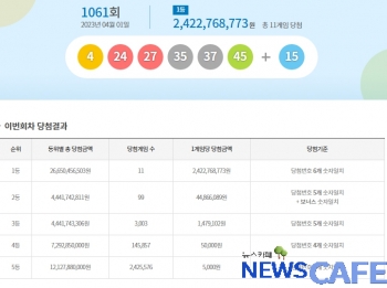 [뉴스카페]1일 추첨한 동행복권 1061회 로또6/45 1등 당첨자는 11명으로 1인당 24억2,276만원씩의 당첨금을 받는다.