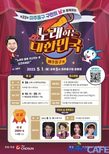 [뉴스카페]인천 미추홀구(구청장 이영훈)가 제33회 구민의 날을 맞이한 경축행사로 TV조선 '노래하는 대한민국'미추홀구편을 개최하고 예심참가자를 모집한다.