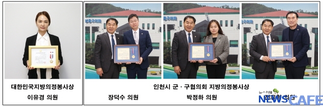 [뉴스카페]인천 남동구의회 이유경, 장덕수 박정하, 전유형 의원이 최근 대한민국시군자치구의회의장협의회 및 인천광역시군구의회의장협의회로부터 지방의정봉사상을 받았다고 밝혔다.