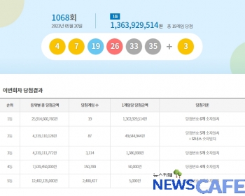 [뉴스카페] 20일 추첨한 동행복권 1068회 로또6/45 1등 당첨자는 19명으로 1인당 13억6,392만원씩의 당첨금을 받는다.