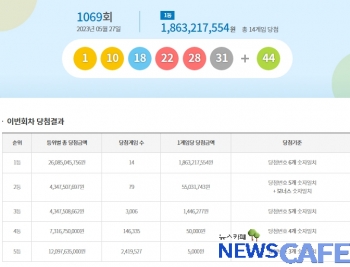 [뉴스카페] 27일 추첨한 동행복권 1069회 로또6/45 1등 당첨자는 14명으로 1인당 18억6,321만원씩의 당첨금을 받는다.
