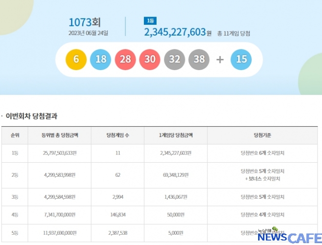 [뉴스카페] 24일 추첨한 동행복권 1073회 로또6/45 1등 당첨자는 11명으로 1인당 23억4,522만원씩의 당첨금을 받는다.