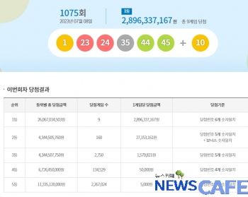 [뉴스카페] 8일 추첨한 동행복권 1075회 로또6/45 1등 당첨자는 9명으로 1인당 28억9,633만원씩의 당첨금을 받는다.