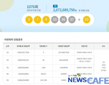 [뉴스카페] 15일 추첨한 동행복권 1076회 로또6/45 1등 당첨자는 9명으로 1인당 26억7,268만원씩의 당첨금을 받는다.