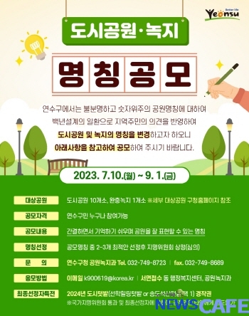 [뉴스카페] 인천 연수구(구청장 이재호)는 오는 9월 1일까지 지역 내 공원과 녹지 11곳의 명칭을 변경하기 위해 지역주민을 대상으로 공모전을 진행한다.