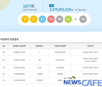 [뉴스카페]22일 추첨한 동행복권 1077회 로또6/45 1등 당첨자는 7명으로 1인당 35억7,090만원씩의 당첨금을 받는다.