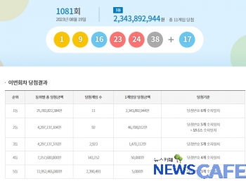 [뉴스카페] 19일 추첨한 동행복권 1081회 로또6/45 1등 당첨자는 1인당 23억4,389만원씩의 당첨금을 받는다.