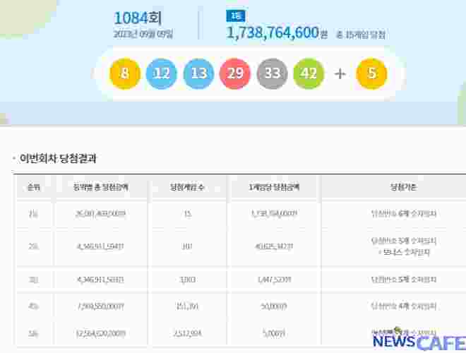 1등 당첨번호는 8, 12, 13, 29, 33, 42번이며, 2등 보너스 번호는5번이다