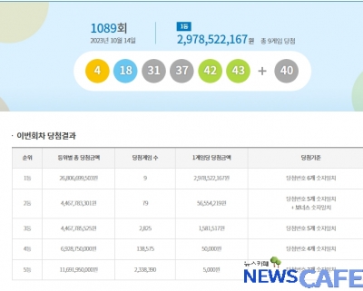 [뉴스카페] 14일 추첨한 동행복권 1089회 로또6/45 1등 당첨자는 1인당 29억7,852만원씩의 당첨금을 받는다.