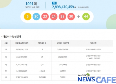 [뉴스카페]28일 추첨한 동행복권 1091회 로또6/45 1등 당첨자는 9명으로 1인당 28억9,847만원씩의 당첨금을 받는다.