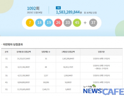 [뉴스카페]4일 추첨한 동행복권 1092회 로또6/45 1등 당첨자는 16명으로 1인당 15억8,328만원씩의 당첨금을 받는다.