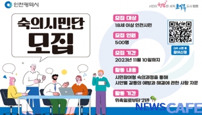 [뉴스카페]인천광역시(시장 유정복)은 제2기 인천시 숙의시민단으로 활동할 500명 인천시민을 모집한다고 밝혔다.