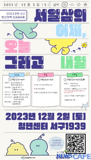 [뉴스카페] 인천 서구(구청장 강범석)는 내달 2일 청년센터 서구1939에서 2023년 한 해의 청년정책 성과와 활동을 되돌아보는 ‘청년정책 성과공유회’를 개최한다고 밝혔다.