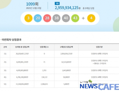 [뉴스카페] 23일 추첨한 동행복권 1099회 로또6/45 1등 당첨자는 9명으로 1인당 29억5,993만원씩의 당첨금을 받는다.