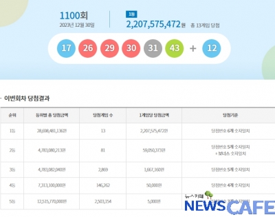 [뉴스카페]30일 추첨한 동행복권 1100회 로또6/45 1등 당첨자는 13명으로 1인당 22억 757만원씩의 당첨금을 받는다.