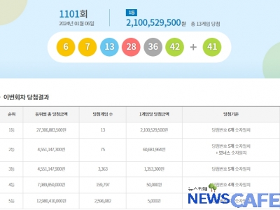 [뉴스카페] 6일 추첨한 동행복권 1101회 로또6/45 1등 당첨자는 13명으로 1인당 21억52만원씩의 당첨금을 받는다.