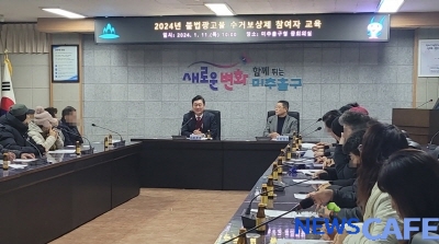 [뉴스카페]인천 미추홀구(구청장 이영훈)는 지난 11일 미추홀구청 중회의실에서 불법 광고물 수거보상제 참여자 28명을 대상으로 직무 교육을 진행했다.