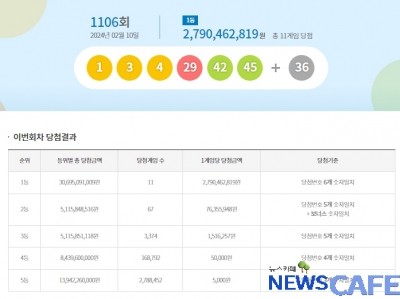 [뉴스카페]10일 추첨한 동행복권 1106회 로또6/45 1등 당첨자는 11명으로 1인당 27억9,046만원씩의 당첨금을 받는다.