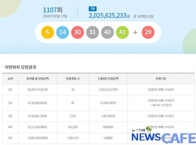 [뉴스카페]17일 추첨한 동행복권 1107회 로또6/45 1등 당첨자는 14명으로 1인당 20억2,562만원씩의 당첨금을 받는다.