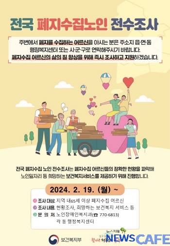 뉴스카페]인천 동구(구청장 김찬진)는 관내 폐지 수집 노인에 대한 지원을 위하여 오는 3월까지 전수조사를 실시한다고 21일 밝혔다.