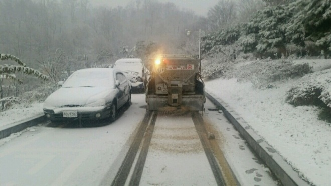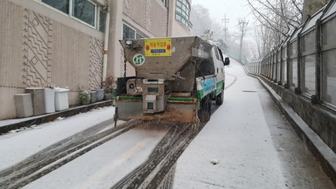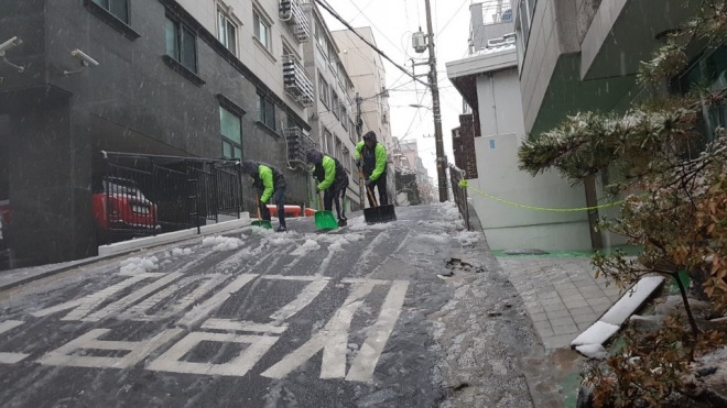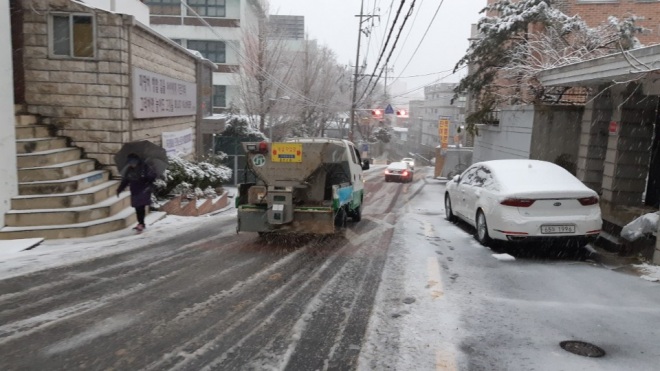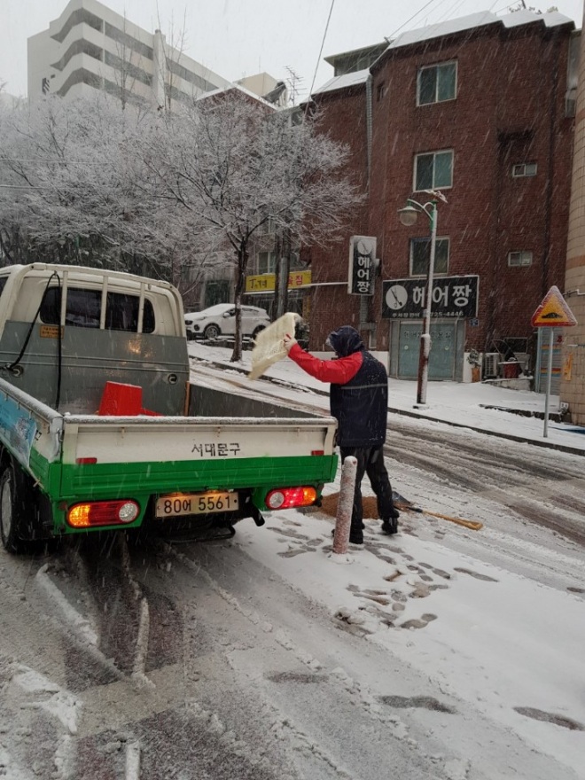 [뉴스카페/이경문기자] 대설주의보와 함께 서울에 첫눈이 내린 24일 오전, 서대문구가 지역 내 경사로 등 강설 취약지역에서 발 빠른 제설작업을 펼치고 있다