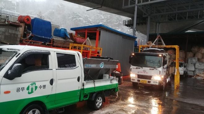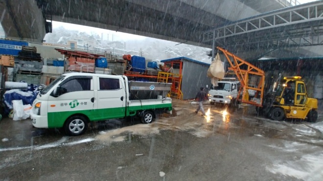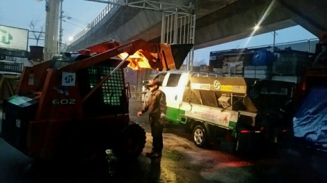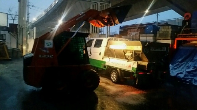 대설주의보와 함께 서울 지역에 첫눈이 내린 24일 새벽, 서대문구가 구청 인근 제설장비 보관소에서 각 동으로 보낼 염화칼슘을 제설용 차량에 싣고 있다.