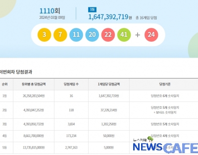 [뉴스카페] 9일 추첨한 동행복권 1110회 로또6/45 1등 당첨자는 16명으로 1인당 16억4,739만원씩의 당첨금을 받는다.
