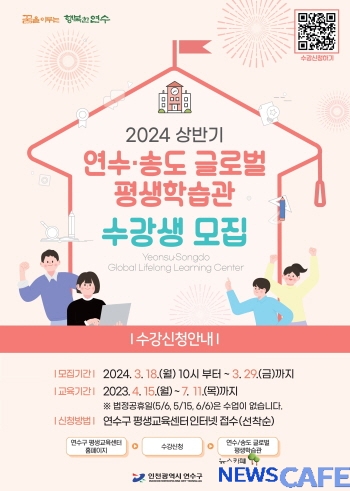 [뉴스카페]인천 연수구(구청장 이재호)는 오는 18일부터 29일까지 ‘2024년 상반기 평생학습 프로그램’ 수강생을 모집한다.
