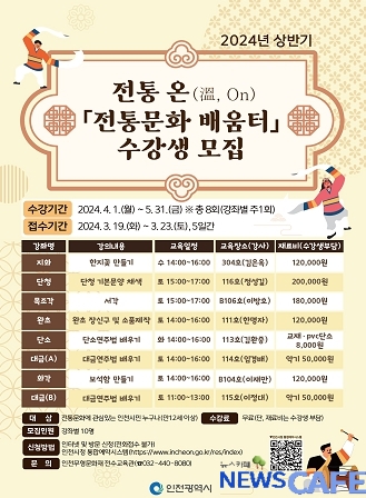[뉴스카페] 인천광역시는 오는 4월부터 5월까지 2개월간(8주, 강좌별 주 1회) 인천무형문화재 전수교육관에서 ‘전통 온(溫, On), 전통문화 배움터’를 운영한다고 밝혔다.