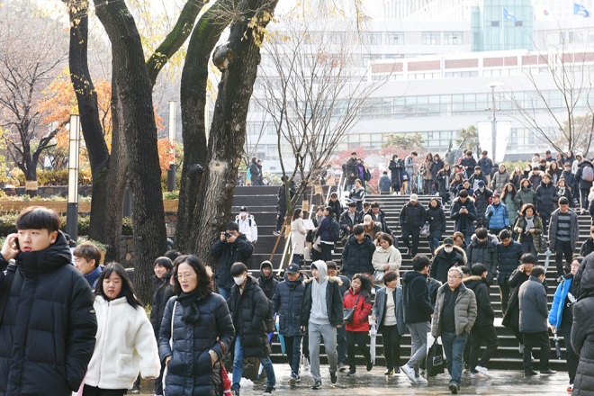 중앙대 서울캠퍼스에서 수험생들이 논술고사를 치르고 고사장을 나오고 있다.