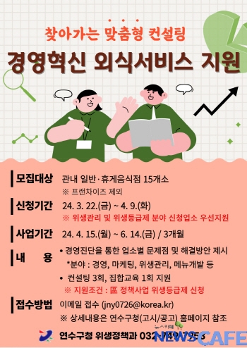 [뉴스카페]인천 연수구(구청장 이재호)는 경영악화를 겪고 있는 지역 내 일반음식점, 휴게음식점 등 15곳을 대상으로 찾아가는 1:1 맞춤형 컨설팅을 지원하는 ‘경영혁신 외식서비스 지원사업’을 내달부터 6월까지 진행한다.