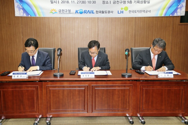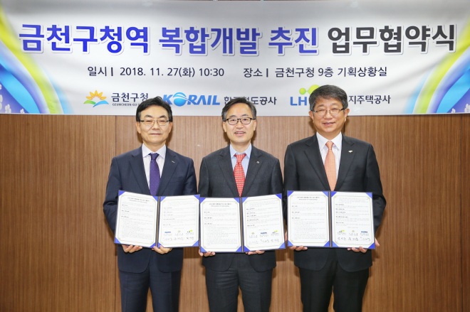 27일(화) 오전 10시 30분 금천구청 기획상황실, 금천구청역 복합개발을 위한 ‘금천구-코레일-LH’ 업무협약식에서 유성훈 금천구청장(사진 가운데)이 협약서를 들고 기념사진을 찍고 있다.