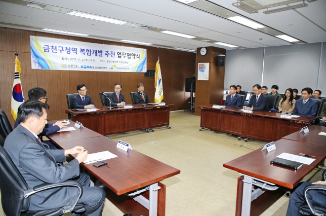 27일(화) 오전 10시 30분 금천구청 기획상황실, 금천구청역 복합개발을 위한 ‘금천구-코레일-LH’ 업무협약식에서 관계자들이 회의를 하고 있다