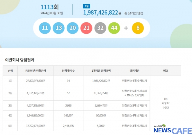 [뉴스카페] 30일 추첨한 동행복권 1113회 로또6/45 1등 당첨자는 14명으로 1인당 19억8,742만원씩의 당첨금을 받는다.