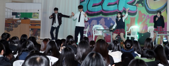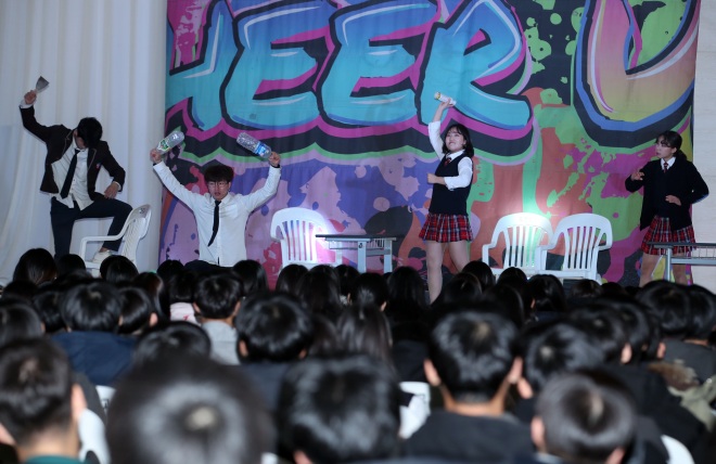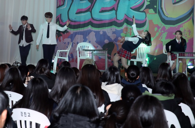 사진설명 : 지난 28일 강진고등학교 체육관에서 흡연·음주예방 뮤지컬 공연
