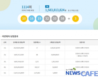 [뉴스카페] 6일 추첨한 동행복권 1114회 로또6/45 1등 당첨자는 17명으로 1인당 15억8,381만원씩의 당첨금을 받는다.