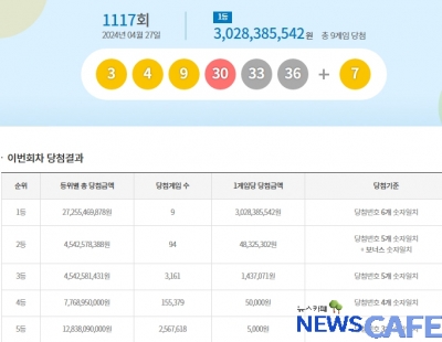 [뉴스카페] 27일 추첨한 동행복권 1117회 로또6/45 1등 당첨자는 9명으로 1인당 30억2,838만원씩의 당첨금을 받는다.