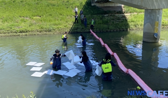 훈련은 사고 접수 후 유관기관 상황 전파, 수질오염 확산 차단을 위한 흡착붐 설치, 흡착포 및 액상 유처리제 살포 등 각종 방제장비의 정확한 사용방법 숙달 및 사고원인 조사 순으로 진행됐으며, 방제 훈련 완료 이후에는 폐기물 처리 및 하천 정화활동으로 마무리했다.