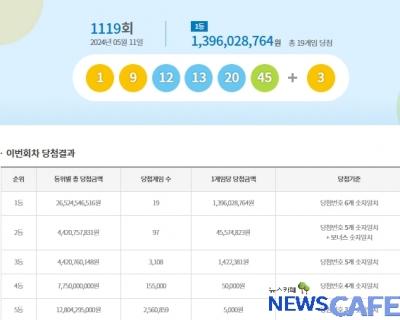 [뉴스카페] 11일 추첨한 동행복권 1119회 로또6/45 1등 당첨자는 19명으로 1인당 13억9,602만원씩의 당첨금을 받는다.