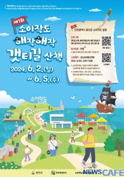 [뉴스카페]옹진군(군수 문경복)은 옹진군주최, 인천관광공사 주관으로 오는 6월 2일부터 ~ 5일까지 4일 동안, 옹진군 자월면 소이작도에서 갯티길 산책 행사가 개최된다고 밝혔다.